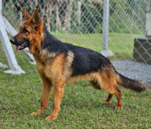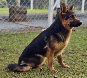 Damina Cielo de Lós Rojos, isenta de displasia, RX-HD – NO, cadela grande, forte e de boa substância, cabeça feminina e expressiva, cernelha alta, muito boa linha superior até a garupa que é de bom tamanho e inclinação, boas angulações no anterior com muito bom tamanho, muito boas angulações de posteriores, muito boa linha inferior, muito bom paralelismo, visto pela frente e por trás, movimenta-se elegantemente, com cernelha alta e com muita fluência, espírito de luta pronunciado, não poderíamos esperar nada menos desta fantástica matriz, pois a mesma é filha dos extraordinários: VA1 (BR) IANK DI CAPELA BATTI x ULTRA CIELO DE LOS ROJO´S, genótipo, cães modernos, que até o presente momento, contribuem geneticamente com a base da criação Brasileira e mundial ou seja estamos falando de uma fantástica combinação genética Alemã, que tem gerado atualmente os maiores e melhores cães mundiais, a nata do pastor alemão, cães VAs, super excelente, campeões mundiais, que transmitem aos seus descendentes uma fantástica estrutura, movimentação e temperamento com caráter, segue foto:
