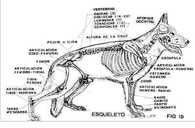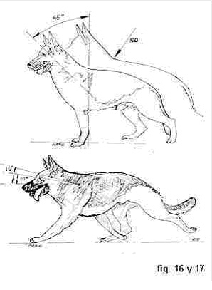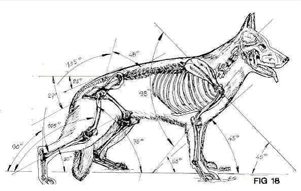 Nesta posição a escápula ou omoplata, osso que define o ombro do perro deve estar com una angulação de 45 graus com respeito à horizontal com tendência a menor angulo (fig.18).