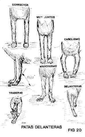 Vistos de frente devem estar totalmente retos, se denomina “canhonismo” a tendência a meter os pés para dentro e se denomina “mancinismo” a tendência a desviá-los para fora (fig.20).