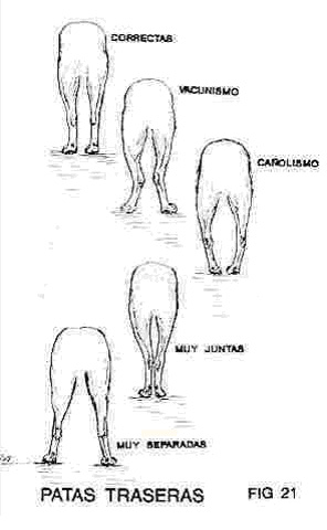 Visto por trás os membros devem ser retos, jarretes para dentro se denomina “vacunismo” e jarretes para fora se denomina “canholismo” (fig.21).