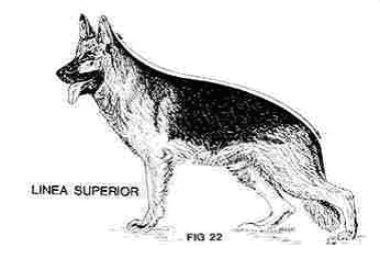 A linha dorsal ou línea superior de um Pastor Alemão parte desde a nuca passando pela omoplata (cernelha) até o final da garupa, formando um arco de círculo descendente (não é uma reta inclinada), quer dizer desde a cernelha a linha dorsal deve sempre descender com harmonia e continuidade sem interrupções (marcações), sem montículos, até o final da garupa (fig.22).