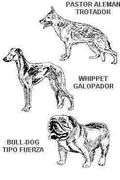 Galopadores: são cães quadrados, garupa grande muito inclinada, ombros levantados e antebraços compridos (galgos).