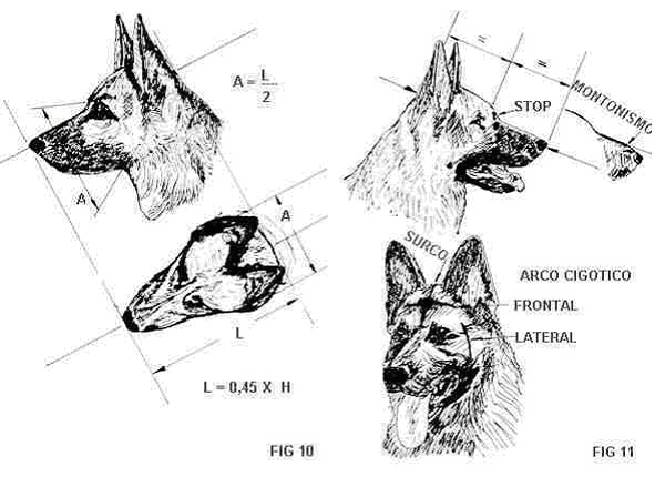O comprimento da cabeça deve ser aproximadamente 45% da altura da cernelha, medida desde a parte exterior da trufa até a apófise occipital externa, por outro lado como já se falou anteriormente, o Pastor Alemão, é um cão MESOCEFALO, portanto, a largura da cabeça será igual à metade do comprimento da mesma (fig 10).