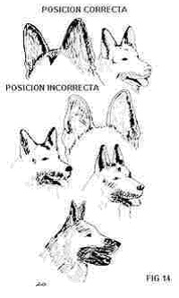 As orelhas são de forma triangular (triangulo isósceles) muito ligeiramente arredondadas nas pontas, de tamanho médio, proporcional ao tamanho da cabeça, posição ereta e ligeiramente convergentes acima da trufa.